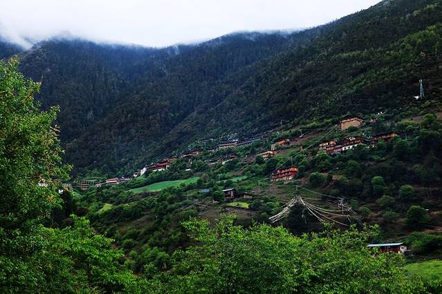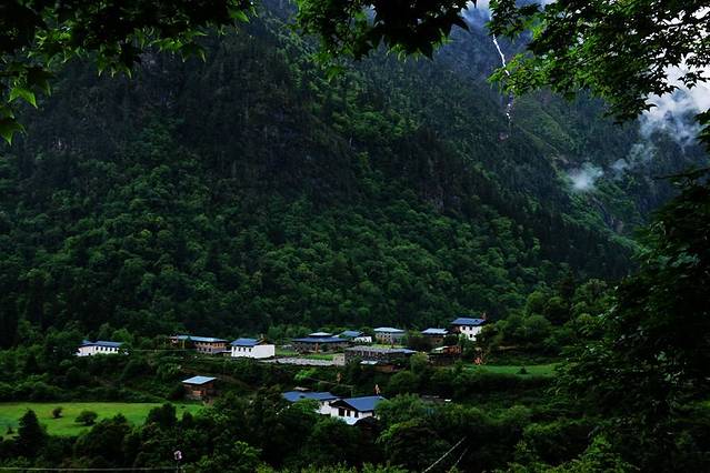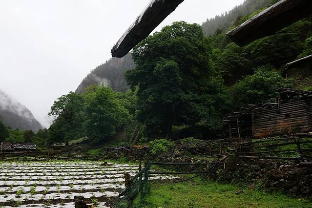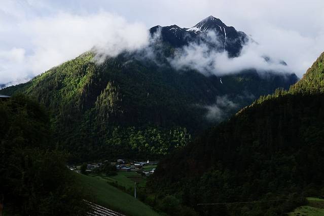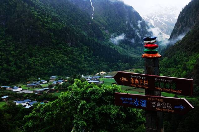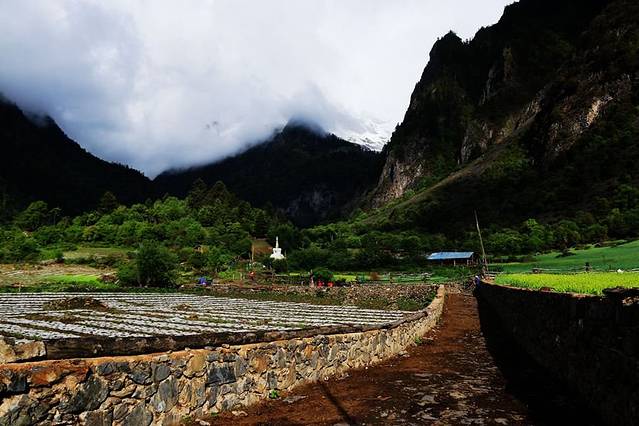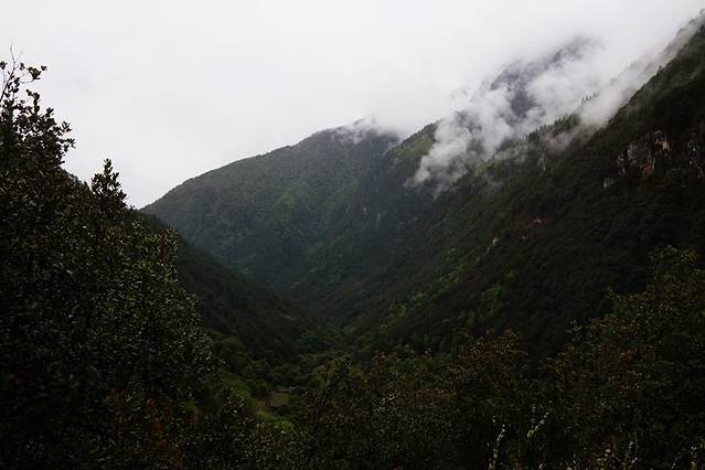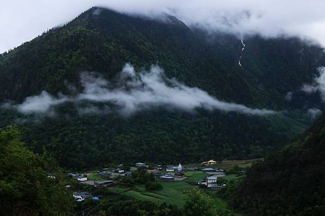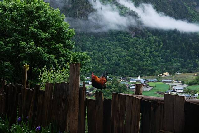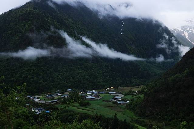 8:30到客栈餐厅吃过早餐,9:00我们一行便按时出发了。因为昨晚下过一场雨,清晨的山里,空气显得更加清新,眼望我们将要经过的雨崩下村,景物清明,旁边的山腰还有云雾的环绕,犹如一条洁白的哈达,这让雨崩下村看起来更具仙气。