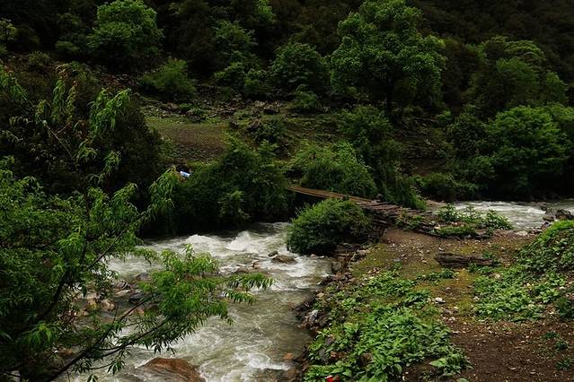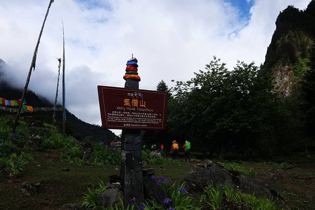 沿之字形,一直下到坡底,要过一座很短的桥,然后再上一道短坡,桥为寒冰地狱桥,坡是西孙西米拉,意为“生死界坡”:朝圣者因功德大,所以自己祖先亲人的亡灵也会跟着来沾光,过了寒冰地狱桥,亡灵一般都会得到解脱,找到光明的往生之路,不再跟着朝圣者上这道坡了,这里的海拔为3031米。