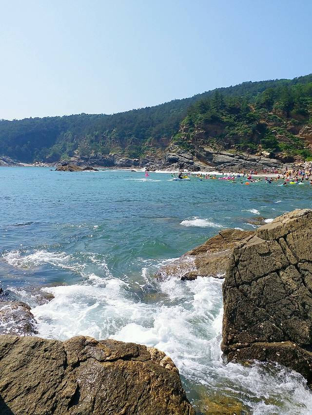 吃过午饭,小憩一会,准备好下海的装备,出发金沙滩…大连的海域有细纱的不多,这里算一处,海水清澈、海浪天然…青山、巨石环绕,美不胜收。