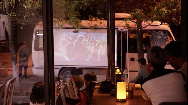 一日兴起,我们在海盗酒堡门口搭起了“巴士露天电影院”,有路人驻足观望的,有邻居听闻赶来的。电影没怎么认真看,倒是唤起不少人儿时在大院里搬着板凳看电影的久远记忆。