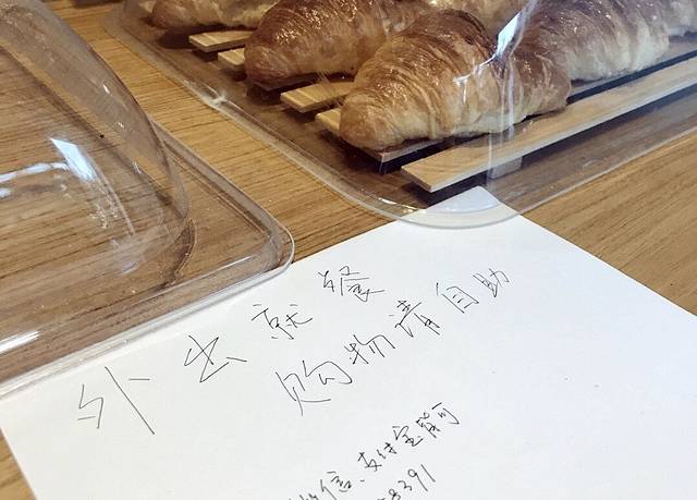 对与山面包久闻其名,第一次走进半坡上的这家店,空无一人,只留了一张纸写着:外出就餐,购物请自助。我有点不知所措:无人商店不该是各种人脸指纹摄像头吗?旁边骑车路过的人似乎看出了我的踌躇,停下来对我大喊:“他出去了,你自己扫码付钱就行啦。”