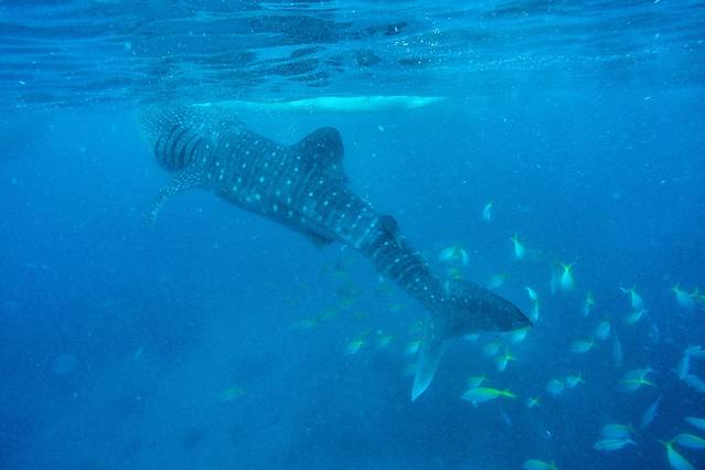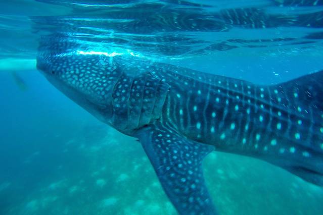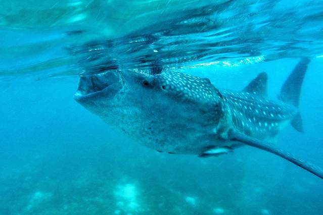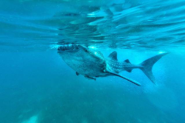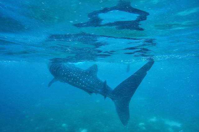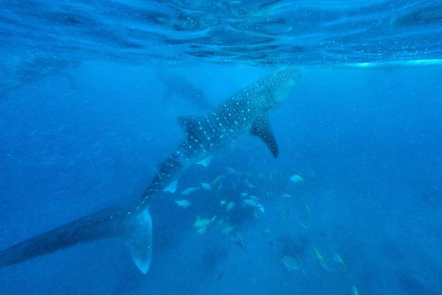 酒店的老板开车带我们,看鲸鲨时直接带我们先去看了,不需要排队和看教育视频。当天浪有点大,不会游泳的最好抓着螃蟹船两边的杆子,鲸鲨还是有好几条,来回游荡,靠近了有姑娘还尖叫。朵朵小姐姐看到鲸鲨游过来了,赶紧跑了。