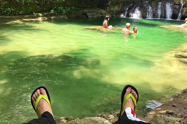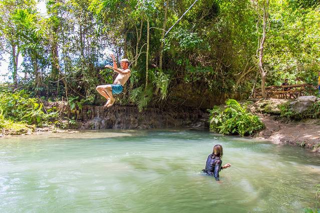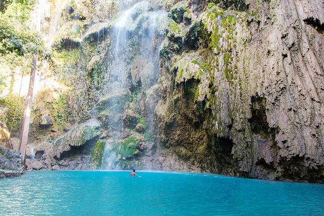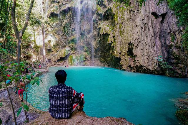 看完鲸鲨就可以去看看这个瀑布,不是很远,湖水是那种纯色的蓝。据说是钙含量高才会这样。我们是来得最早的一批人(因为看鲸鲨要起很早过去,而且老板开了霸体功能,直接让我们上船看鲸鲨了),强烈吐槽几个 韩国 人,湖水很清澈,就他们几个人一直在那里面搅浑水,弄得大家都不愿意拍了。