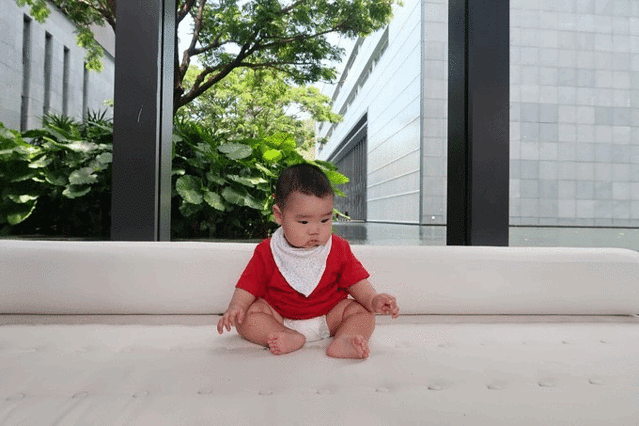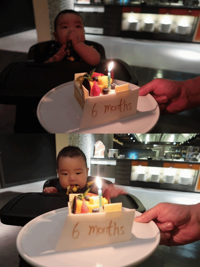 20号那天是小虎满6个月的日子,早上我路过前台时问了一下有没有生日蛋糕,工作人员了解情况后果断送了我一个,小小的芒果味蛋糕,非常非常感谢。在酒店餐厅办了个小宴会,主角因为一直睡不醒,快吃完了才露面。