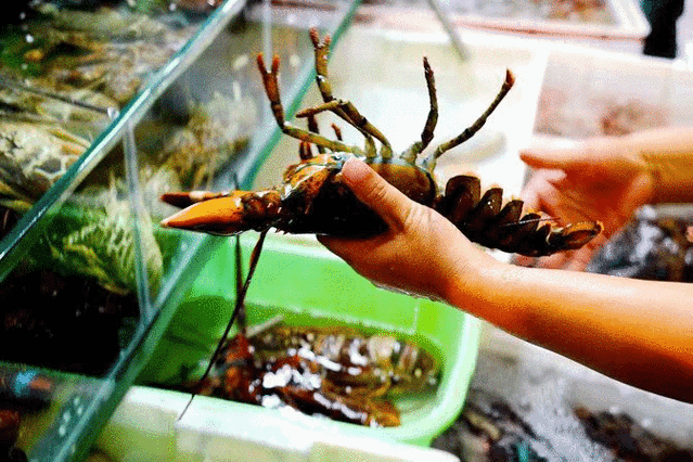 到了小胡子之后呢,他们就安排了一个工作人员带我去买海鲜,这里可以看他们表演啦!商家跟小胡子家店员的口舌之争!最终一只120块的澳龙被我们80买一下来!!!!(佩服)