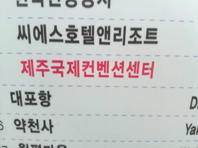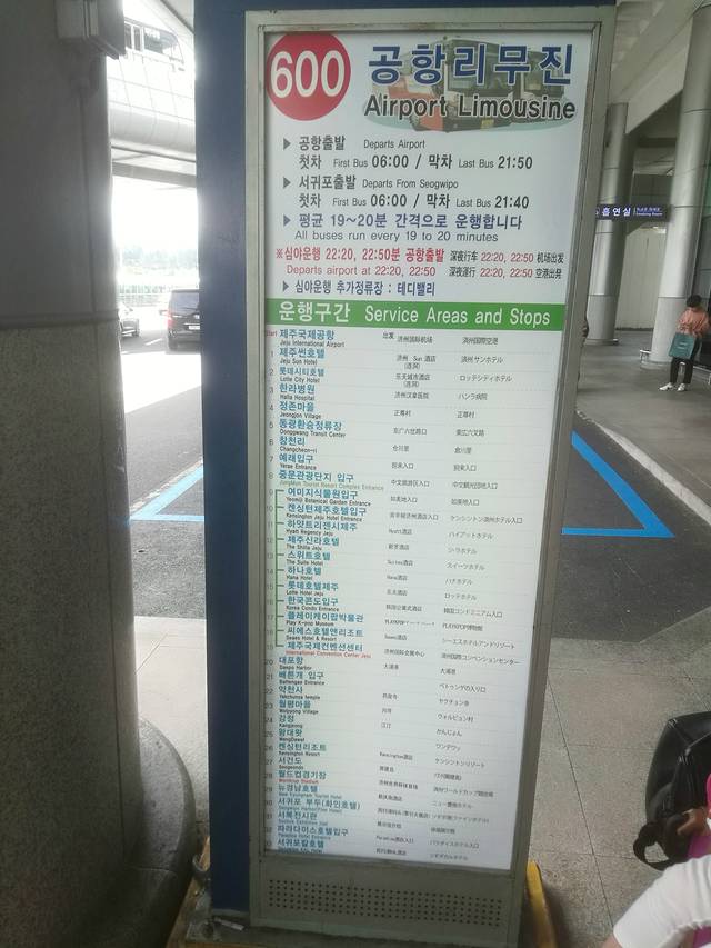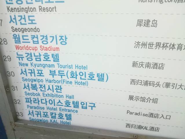 공항(机场)-더호텔(TheHotel)-르네상스(万里海景酒店)-여미지입구(如美地入口)-하얏트호텔(君悦酒店)-신라호텔(新罗酒店)-스위트호텔(SUITES酒店)-하나호텔(韩亚酒店)-롯데호텔(乐天酒店)-한국콘도입구(韩国CONDO入口)-한국관광사(韩国观光公社)-퍼시픽랜드입구(太平洋乐园入口)-씨에스엔호텔(CSN酒店)-컨벤션센터(会展中心)-대포항(大浦港)-약천사(药泉寺)-강정(江亭)-풍림리조트(枫林渡假村)-서귀포월드컵경기장(西归浦世界杯赛场)-뉴경남호텔(新庆南酒店)-서귀포부두(西归浦码头)