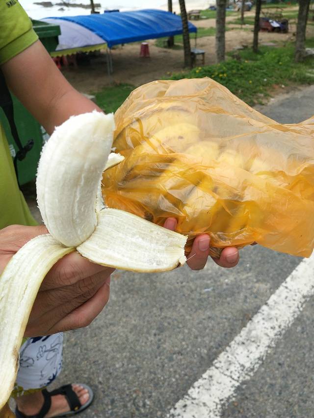 10点出门,酒店斜对面杭州小笼包店吃了顿早餐,吃完回酒店路上问三轮到日月湾多少钱,三轮师傅说太远了,不去,建议我们坐公交。于是赶紧回酒店退房,刚好赶上10点50到日月湾的5路公交(兴隆到日月湾公交班次较少),中间会经过石梅山庄,想去石梅湾的可以在这里下,我们选择直接到日月湾。也许是中午的原因,海边游客较少,冲浪者较多,倒是小吃街游客挺多的。把行李寄存在路边冷饮店,沿着海边不知不觉走了一圈,回去的时候,看到一对母子在小沟边摸螺,捉螃蟹,就帮他们捉螃蟹,竟然不知不觉捉了一个多小时。然后到小吃街吃东西,略贵,味道一般。吃完问人怎么去分界洲岛,老板说没车了,也不远,你们就散步走过去好了。手机一查,6公里左右,相当于平时晚饭后散步的距离,就决定徒步前往了。走在路上一个挑着担子的老人卖我们一串野生米蕉,6元,好便宜就买了,味道不错。感觉比超市卖的大个一点的好吃很多。心情棒棒哒的沿着海边走,没过十分钟,天黑了,突降暴雨,躲路边树下叫了辆快车,50元到香水湾,车上临时订了香水湾的公寓旅馆,放弃去分界洲。