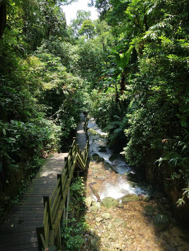 10点多退房后,来到五指山汽车站,去五指山自然风景区其实是在汽车站对面坐去水满乡的公交,不是在汽车站买票,不然就像我闹个小笑话了。去到窗口说买张到五指山的票,售票员说这里就是五指山,愣了下,售票员说马路对面坐公交。把行李寄存到汽车站后,在附近买了点水和干粮,就去对面坐公交了,10元1人,乡路有点绕,一路上很多本地人上上下下,蛮贴近生活的。发现这边的小孩眼睛都好漂亮,特别亮。到终点站后,坐上黑车到五指山脚下,20元,走路太远了,我们坐的黑车接送来回加两张门票一共100元。五指山门口标着50元门票,淡季42元。有3条路,一条通往主峰,来回爬完估计要4,5个小时,一条古道,较窄,加一条木梯路都是通往昌化江之源,刚开始信誓旦旦要挑战主峰,可是台风刚过,一路上一个人都没有,刚爬就看到一个手掌大的蜘蛛,加上山路偏原始加非常茂密,偶尔有点泥土路,隔一段就有注意毒蛇标牌,不到十分钟就后怕了,打退堂鼓了。然后去爬木梯栈道了,因为没有人,一路上也很怕,走的很快,半个小时左右就到源头了,源头发现还有3,4个人,瞬间不怕了,吃了点自带干粮,元气满满下山了。幸好下山及时,又一个大暴雨,有点遗憾,雨天雾大,没有看到标志性的五指。黑车师傅接我们回水满乡,车上坐着一对从三亚来的情侣,早上9点多就开始爬了,现在下午3点多才下来,看他们都累瘫的样子,感觉自己决定对了。回到水满乡,刚好坐上回市区的小巴,路上看到不少人在漂流,因为之前在清远漂流被吓到了,所以不是很喜欢漂流,有喜欢峡谷漂流的可以考虑。回汽车站后,买了去琼中的汽车票。