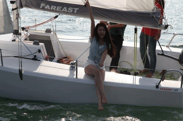 往这边侧过来的时候,我坐在船舷上可以直接把脚放进海水中,爽吧! 才发现船长跟她家水手竟然红配绿……o((≧▽≦o) 太好笑了!