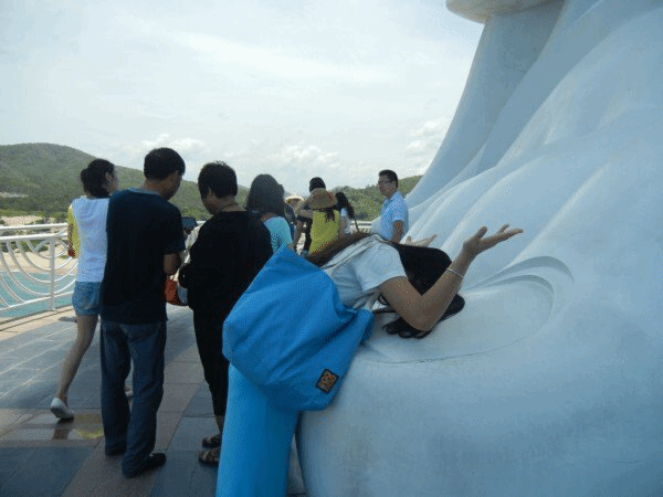 坐电梯上了莲花座,拍到虔诚祈福的女孩子