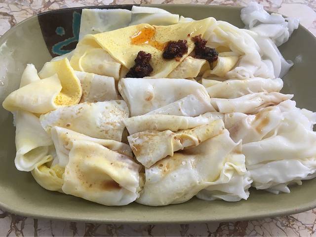 这间店用的米浆是用纯米浆,做出的肠粉不似时下流行的那种追求半透明有韧性的。店铺提供的调味料比较特别:淡酱油,豆鼓红油牛肉味的微辣酱,吃之前须自己淋在热热的肠粉上。