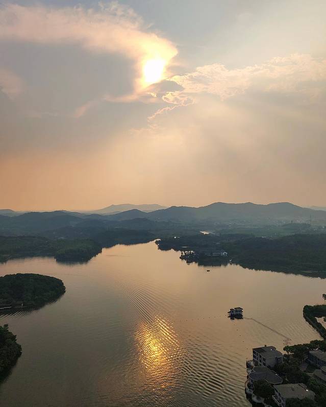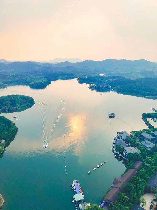 出了茶岛,到了氦气球,90元/人,正好是傍晚,人也不多,一次上去只有6个人,上下总共15分钟,在150米高空停留了5分钟。看了晚霞,俯瞰这个天目湖、水世界,可以说非常壮观了。