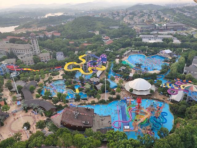 吃完饭已经18:30多了,打车回去宾馆拿了泳衣就打车再去水世界,一开始以为入口就在花园酒店那边,结果水世界夜场(17:30之后)只能从山水园进去走大概5-10分钟才能到水世界入口。夜场时间是17:30-22:00,我们去的时候已经19:00多了。但是如果白天进去只要不出来,就可以在里面一直待到结束的。进入需要换衣服,需要租储存柜,标准柜子够2个人用,租金30,交30押金还钥匙时退还。柜子和换衣服的是分开的,所以男女可以共用一个柜子。我们都喜欢刺激的项目,所以进去就直接往巨蟒的下滑隧道走。但是自由落体那种就不让戴项链,也不让戴手机,哪怕装在防水袋里挂脖子上也不行,所以又走回柜子放了手机什么的再进去。不过体验完了之后,理解为什么不让挂脖子上。这个刺激度,手机该是从头上脱掉自己下滑了。基本上,每个项目都有刺激和不刺激之说,按轨道倾斜度和长度等区分。所以每个项目我们都爬了2回楼梯上去,体验了2回。还有家庭大滑板,就是5、6个人盘腿围坐在一个气圆盘上,往下滑。也有租单人、双人、三人泳圈的,可以进入大台风水域,其实就是一个泳池。我们进去的比较晚,也没有租泳圈,因为租单人泳圈租金30,押金30,双人的租金50,押金30,三人的似乎更贵,没看仔细。我们2个人都想进去游泳,但是吧,没戴泳镜,也是有点迷了。进去的时候已经21点20多了,所有也没待多久就21:45清场了。因为水庐宾馆距离水世界也就1公里,所以不高兴换衣服了,直接穿着泳衣走回宾馆。这一天确实是有点累了,下午走路出汗双腿之间摩擦得,都蹭破了,走路都不好走。(大概是太胖了,肉肉蹭肉肉。哈哈哈)