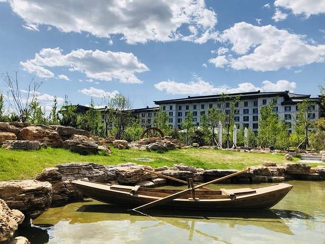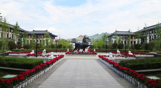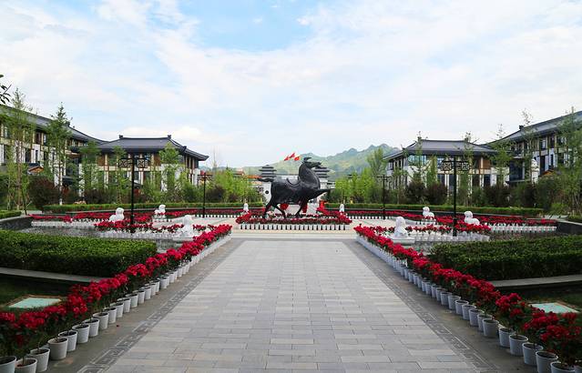 安顿好行李,小憩一会儿,我们俩便到小镇的园林里散步。边走边看,汉唐建筑风格的小镇,颇有古风之韵,看惯了现代化的建筑群,此刻深深觉得这种风格清新雅致,别有一番趣味。放眼望去,周围群山环绕,碧水蓝天,用古人的眼光看,此地风水甚好,想着如果能长期居住在这个地方,必定能长寿。我笑着和老公说,以后如果可以常来这里走走,长命百岁就不成问题了吧。