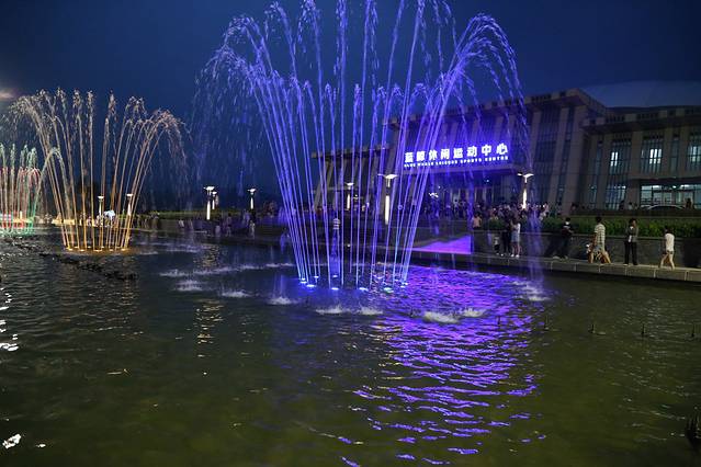 已是傍晚时分,蓝鲸休闲运动中心门前的音乐喷泉,在红蓝交错中交相喷放,不少涞源当地人晚饭过后带着孩子来这里玩耍。这里每到傍晚就成了一处欢乐的海洋。