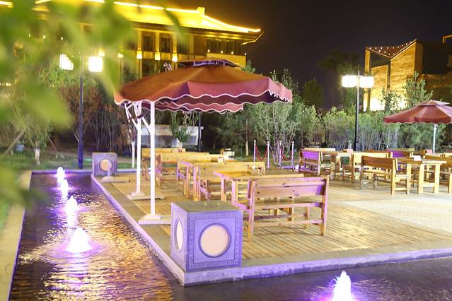 爬完山,又累又饿,早就垂涎小镇的花园烧烤了,于是径直来到了这里。夏季傍晚的烧烤,伴着彩色的微光和小的涌泉,还有些许的情调!一天的劳累化作撸串的动力,不得不说,这里的肉串相当“地道”,肉鲜味足。不仅仅有烤鱼、肉食,各色素食也相继端上了桌。先不说味蕾是否被挑逗,对于我们,这亦是一次浪漫的约会。正当我和老公商量是否要早点回去休息的时候,身旁突然想起了琴声。民谣声起,我们便不自觉的哼唱起来......想不到此次还有意外收获。