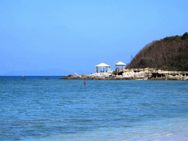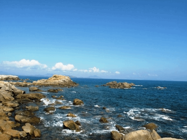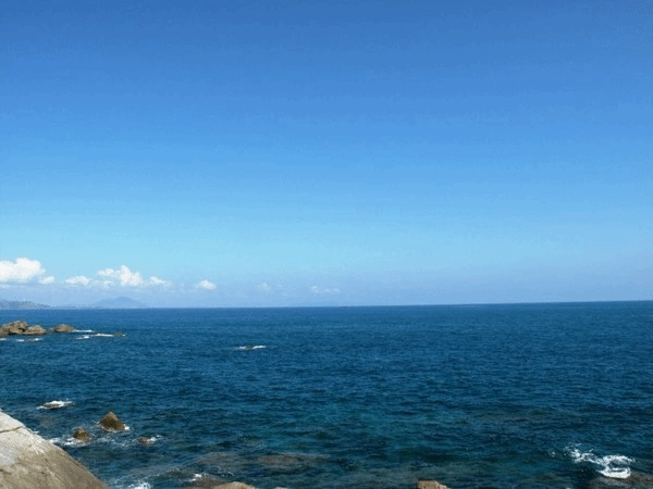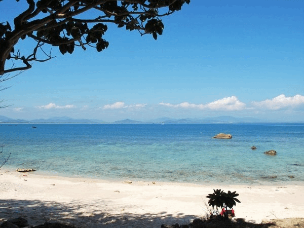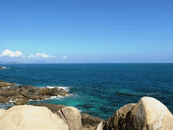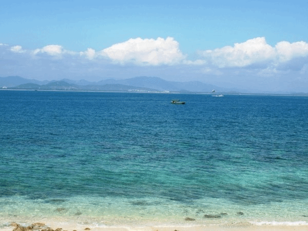 小岛仍在开发中,这是后山部分,游人只能坐电瓶车观景,尚不可步行通过。车沿海岸线缓缓而行,沿岸地势高低起伏,岸边多为礁石。海水透明纯净,颜色深深浅浅,层次分明。车子不停,随便举起手中的相机咔嚓咔嚓,就是上面的照片了。