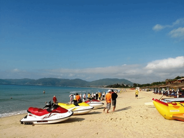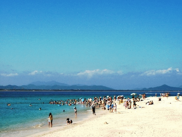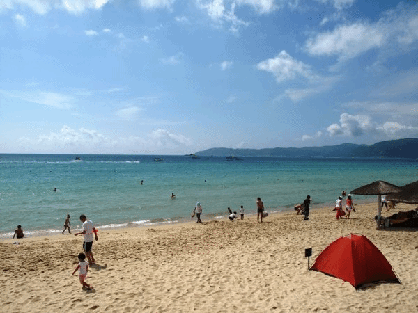 天气晴好,天蓝海蓝,坐游艇来到蜈支洲岛。银白的沙滩上,游人自在嬉戏。
