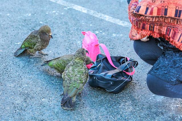 又是一处雪山观景点,这里可以看到很多高山鹦鹉的身影,它们早已习惯向人们讨要吃食,虽然路旁的牌子上标注的紧致喂食鹦鹉,但是鹦鹉们似乎更加热情,直接自己动手拉开游客们的背包,这倒是让我想到了 峨眉山 的猴子,也是这么自来熟。