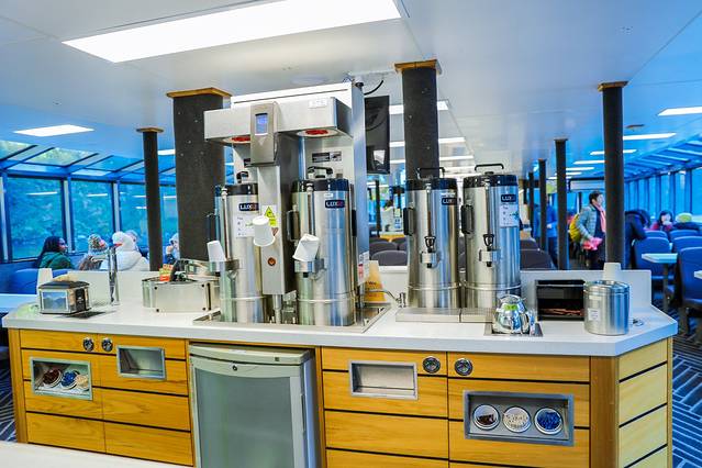 按照船票上的座位号我们的位置在船的三楼,一楼是自助餐厅区,二楼三楼是乘客休息区。三层可以通过室外楼梯通向顶层观景甲板。