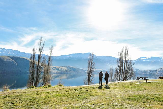 我们开车沿着瓦卡蒂普湖行驶了一圈,终于找到了一个有空位的停车场,在 新西兰 停车的话需要注意看限时提示,一般划线停车的地方会标注此处停车可以免费停放多少时间, 比如 120分钟,240分钟等等。