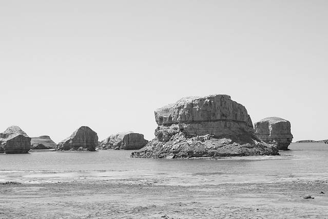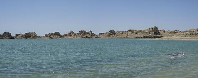 水上雅丹位于G315国道的东台吉乃尔湖以西的地方,与之前在新疆乌尔禾魔鬼城看到的雅丹景观相比独具一格,是一个令人向往的地方。我们到水上雅丹的时候已经临近中午,虽然外面骄阳似火,但气温还是有点低,跟随者观光车踏上了这片神秘的土地。