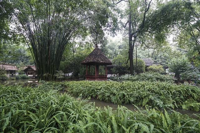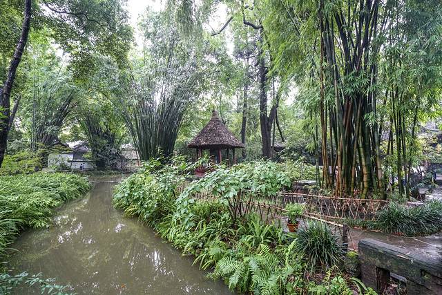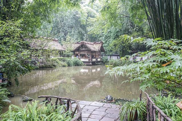 杜甫草堂占地面积近300亩,完整保留着明弘治十三年和清嘉庆十六年修葺扩建时的建筑格局。虽说是保留了格局,但今天的鸟语花香的草堂,早已不是“八月秋高风怒号,卷我屋上三重茅”那个可怜的草堂了。