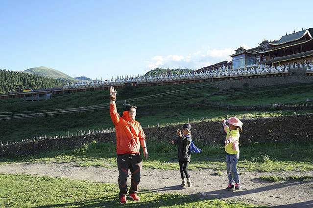 竹庆寺外,爱玩的峰哥和热情的藏族小女孩跳起了欢乐的舞蹈~