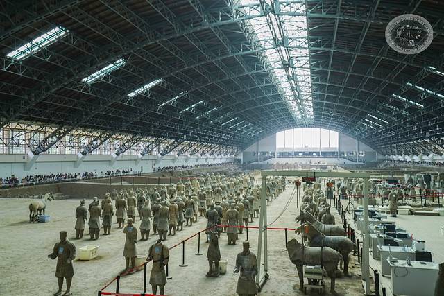 在一号坑内还有一些正在修复的兵马俑,旁边就是考古科研人员的工作台,正是有了他们无微不至的“照顾”,才能让兵马俑们“活生生”的展现在人们面前,向他们致敬。