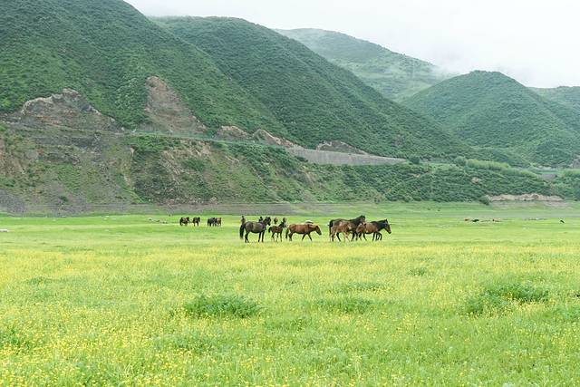 在门源到塔尔寺的路上,队长峰哥发现了一片草场,沿着公路右侧进去大概1公里,便能看到有一个牧场,远方的草场上开满了黄色的野花,俊美的马儿、牛儿正在这悠闲的踱着步,而我们这群不速之客,打破了这份宁静,只想尽情地和它们一起狂奔。(由于才刚下过雨,草场上全是水,前往撒欢的朋友们要注意哦,不要感冒了~)