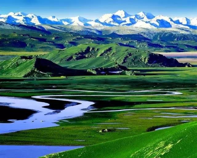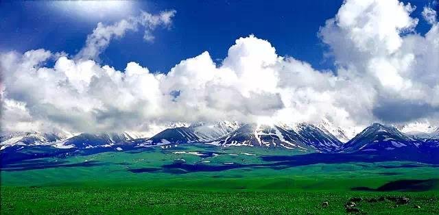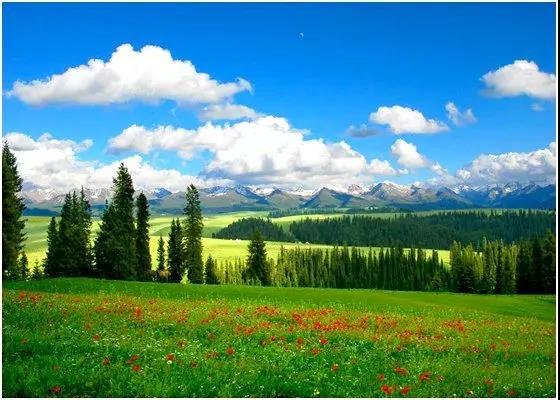喀拉峻草原呈连绵的丘陵状,背靠巍峨雪山,草原上还有树林、花海等景观,景色辽阔秀美,犹如一幅舒展的碧色地毯,一直铺展到皑皑冰雪的高山脚下,美不胜收,难怪有人说来到这里就想起梦中的天堂!