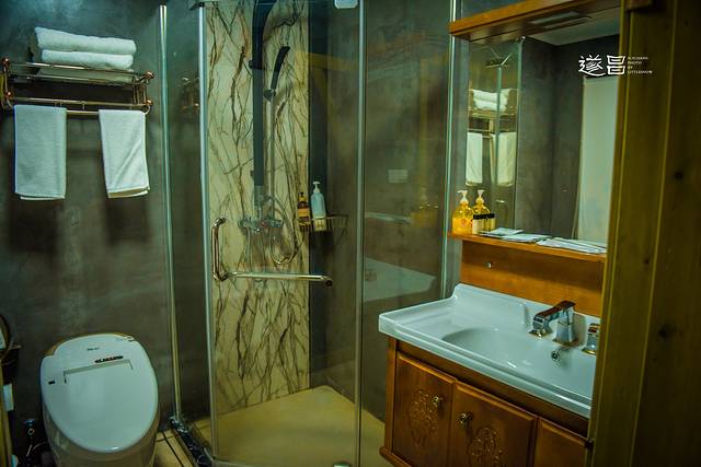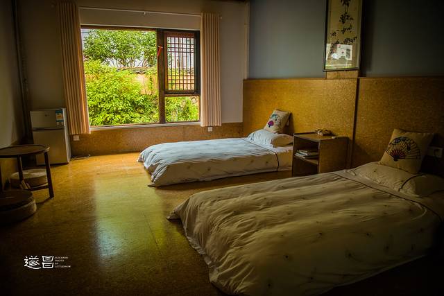 在房间的入口处也是一处长廊,一排房间的正对面被设计成了一面假山墙,石头成排,花草错落,底部还有水流划过,给人一种曲径通幽的意境。每个房间的门牌号被设计成具有禅意的名字,我们住的房间唤作“心禅”,来到这样一座客栈,即使心情再怎么焦躁,在走进这里的那一刻也会安静下来欣赏吧,如果真的可以,我真想坐在长廊看一整天的白云蓝天。