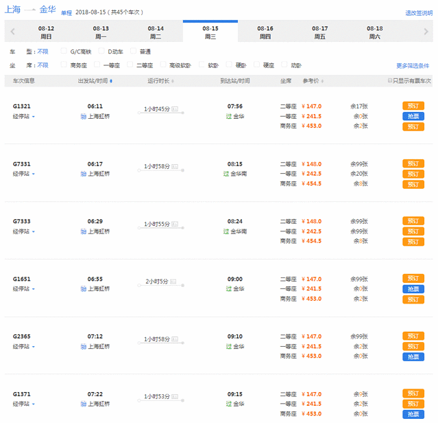 高铁:从上海至金华一天有45个车次,时间大约为2小时,二等座票价148元,是比较节省时间的出行方式,这次出行我便是乘坐高铁往返上海和金华,非常方便。由于动车和火车车次非常少,而且出发时间很晚,到达金华也已是深夜,就不推荐了。