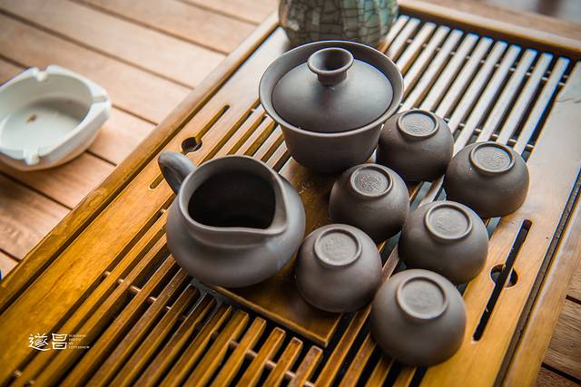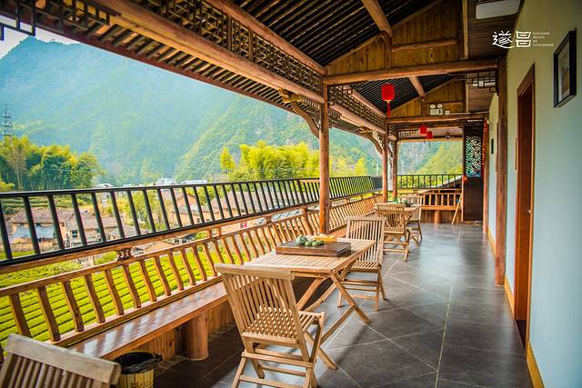 客栈不仅仅只有客房,还有一处长廊,整个长廊从下面的护栏到上方的屋顶,皆由木头垒砌而成,纯木质的桌椅上放着一个竹制茶盘和一套紫砂茶器,可以看得出店主是一个非常有情调的人,能把这里打造的这么雅致,可见在其中花费了不少心思。在这里喝茶聊天,还可观望远处的青山绿水茶园,景美如此,夫复何求。