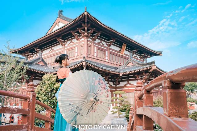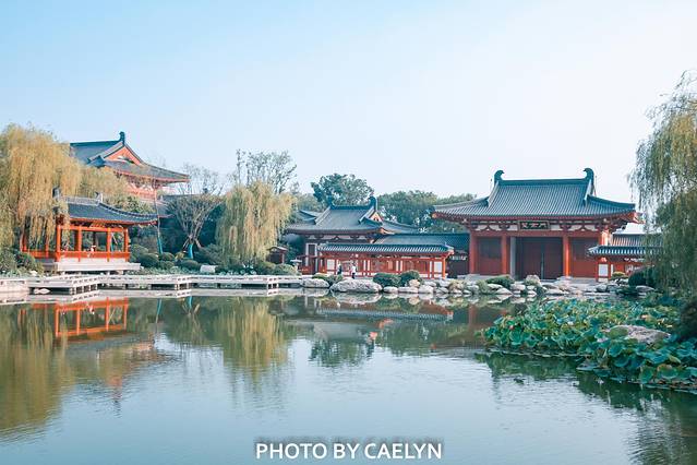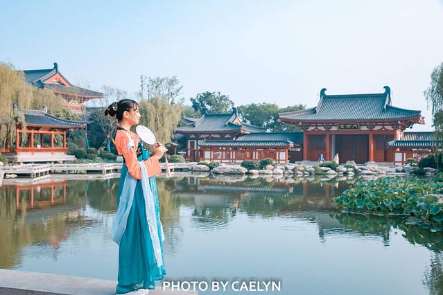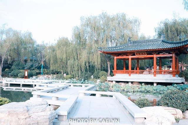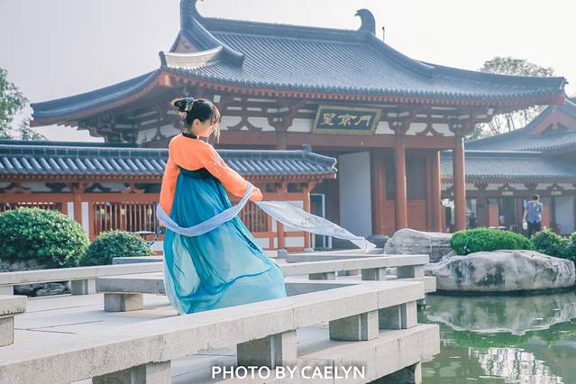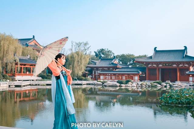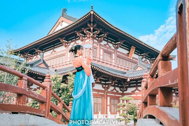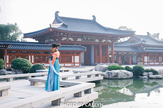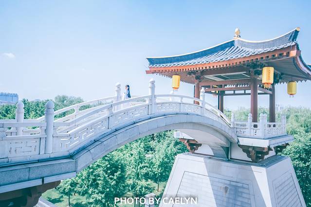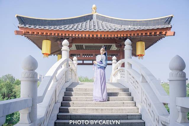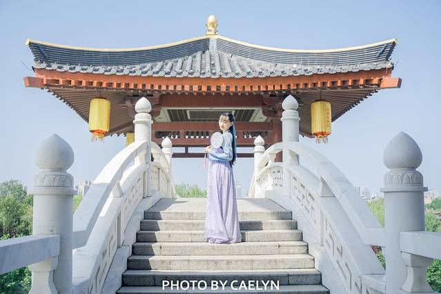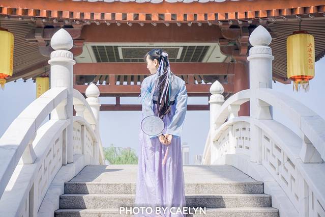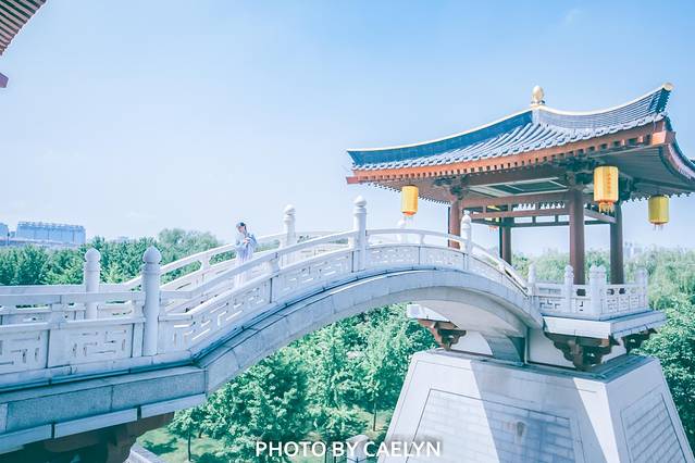 除了华清宫,大唐芙蓉园也是一个拍汉服旅拍的好地方!最喜欢的就是这座桥,怎么拍都很美。