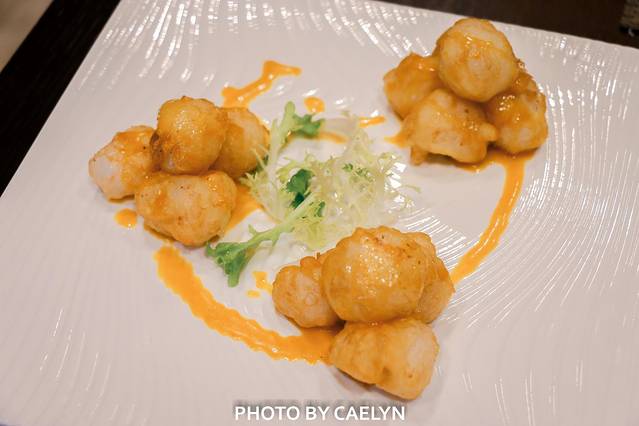 荔枝虾球味道稍微有些偏甜,是把整个的虾仁包在荔枝里面,油炸至金黄再浇汁,摆盘也超级美哦!~