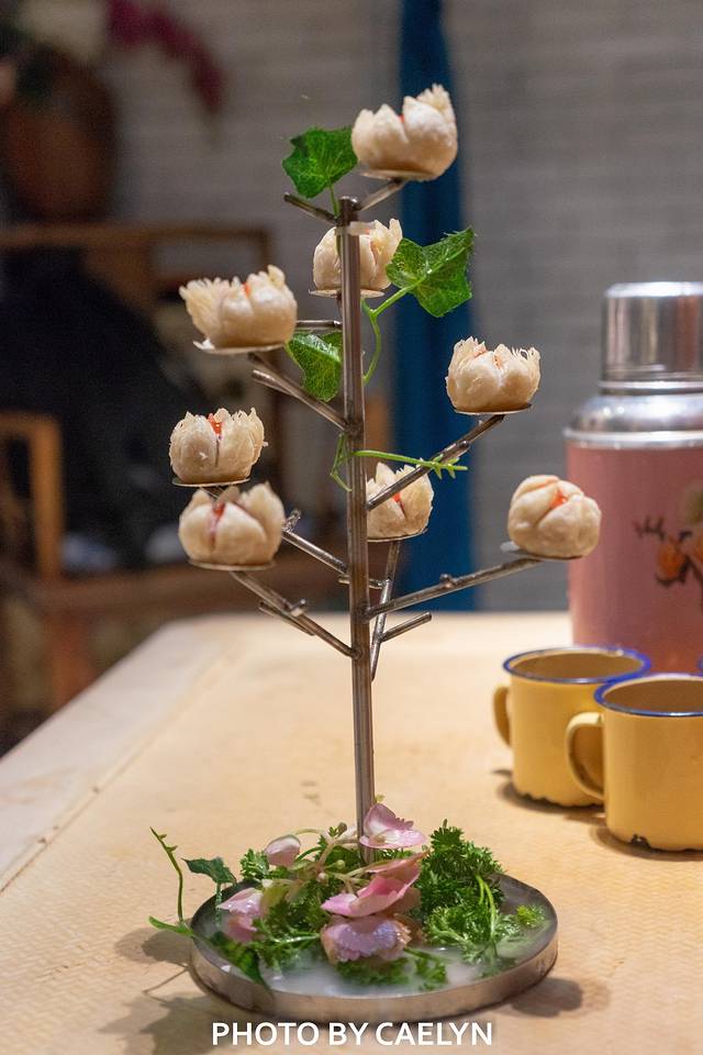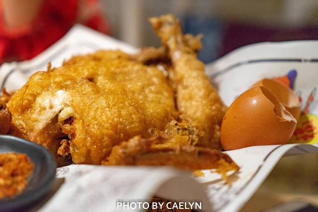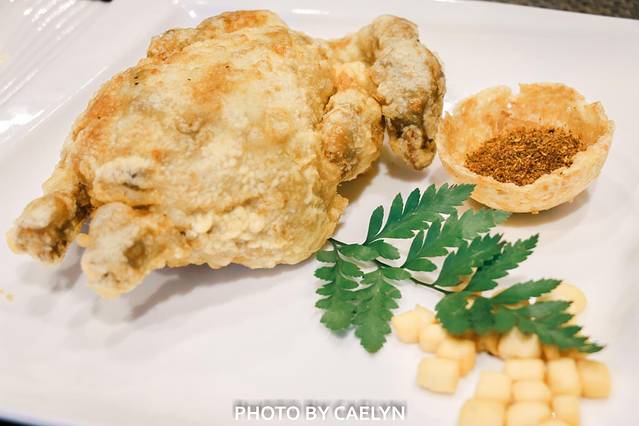 重头戏的葫芦鸡也上来啦!鸡肉整只炸的金黄酥脆,撕开后还冒着热气腾腾,沾一下椒盐的调料,入口外焦里嫩,超级诱人!