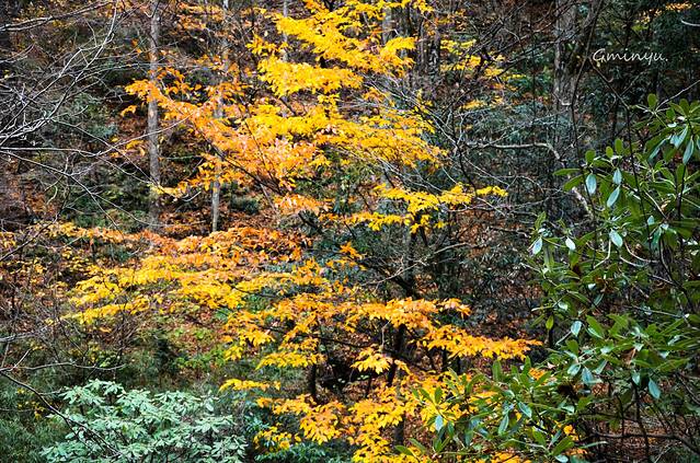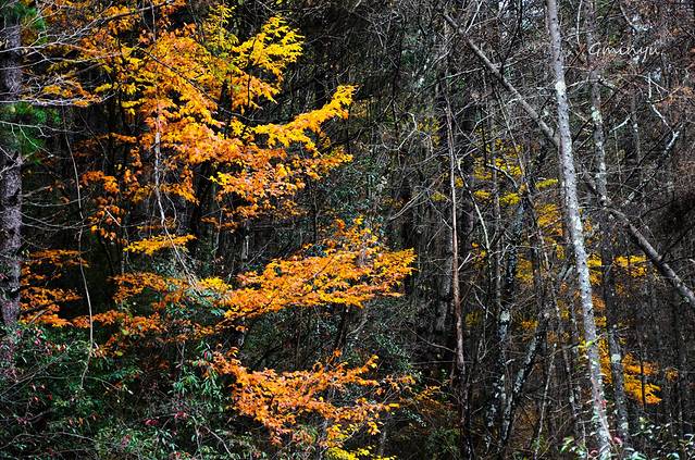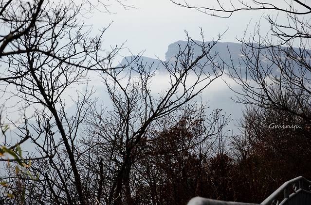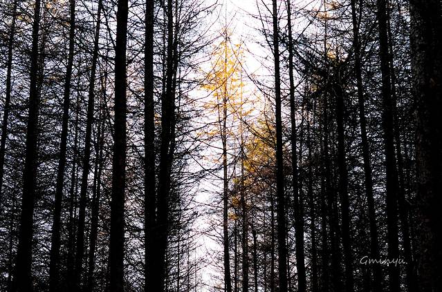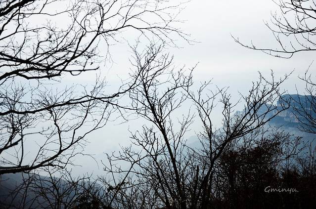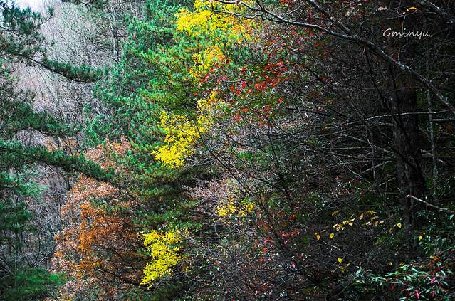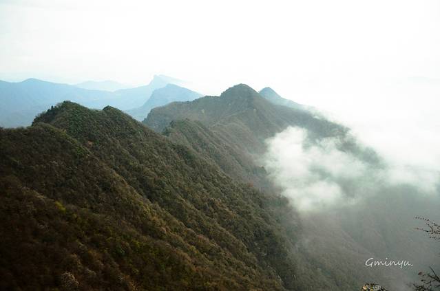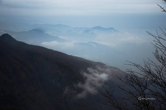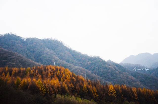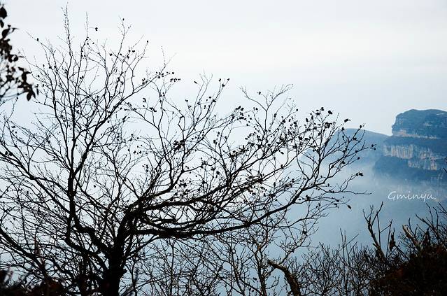 十一月的天,山里已是北风飘飘,不耐寒的我默默的裹起了大围巾。天微微亮,一路上虽看不见网上说的漫山红叶,但越往里走就越瞅着偶尔几株金灿灿的树在山腰上摇曳。在别处读到的画面,最美的是光雾山的十里画廊,来到一看虽说错过了红叶却领略到枯枝的另一番美。这下,我是知道了,风闯过枝丫的声音像极了鹏鸟的展翅,而我悄悄的录下了这片山头奏起的乐章。