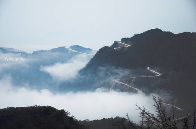 我们的车就是从对面这蜿蜒的山路一路开过来的,要说翻过了几重山,怕大家是晕乎乎的已经记不得了。再后来下山的时候,这条路已经被云雾覆盖了,咱真的是穿着云层过,坐在车里向外看根本看不见路,在能见度基本不足一米的山路上下来还得会车,全程都是各种喇叭声。隔壁坐着的老司机,脚也不自觉的在跟着踩刹,所以你们说这片光是雾的山头是埋没了多少“秋名山”车神呐