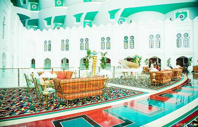 远远望去,酒店的外形仿佛是一座水上清真寺,与传说中的辛巴德或阿里巴巴时代的皇宫也略有相似,有着浓郁的中东风情。其内部更是金碧辉煌,据说耗尽22吨纯金打造,更有上千盏施华洛世奇水晶吊灯、海量的大理石,甚至还用几万朵的新鲜玫瑰作为装饰。