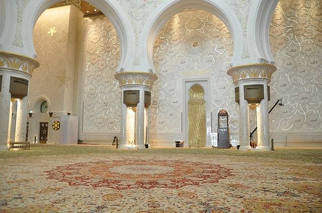 谢赫扎耶德清真寺的这块地毯被誉为全世界最大的地毯,大小近6000平方米,由近1200名伊朗工人耗时12个月手工织成,用的都是来自伊朗和新西兰的顶级羊绒,光设计就花了8个月。而最令人惊叹的是地毯上没有一处缝痕。踩在上面软软的,无声无息,主殿弥漫着一种恬静祥和的气氛,可让人心里顿感安宁。