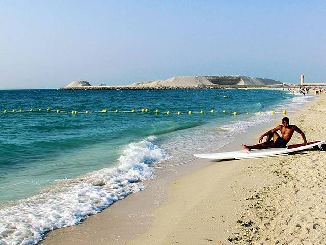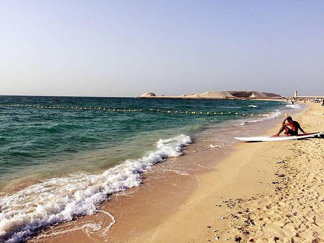 在迪拜,除了各大酒店的私有沙滩,这里也是迪拜唯一的能公开穿泳装的地方。海滩上有公共浴场,可以租借沙滩椅。来此可以看到人们大多在沙滩上休息,有不少比基尼美女和金发帅哥。有的坐在海滩上欣赏海景,有的躺在沙滩上晒太阳,个个都悠闲陶醉,仿佛都沉浸在海滩的浪漫和海水的柔情中。远处的海中还可以看到游泳者和趴在冲浪板上,逆着海浪努力往外划着的冲浪者。