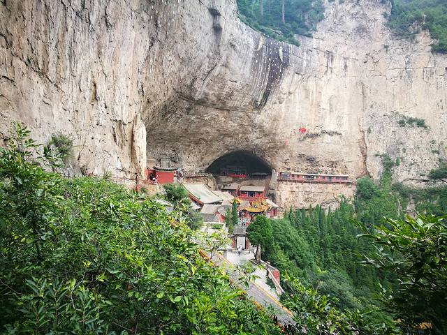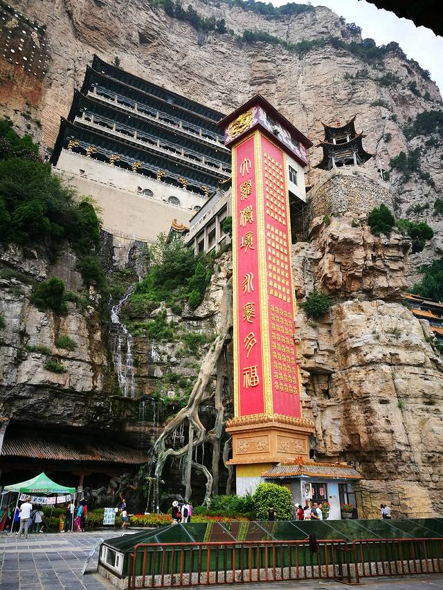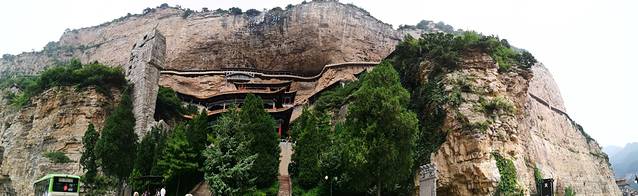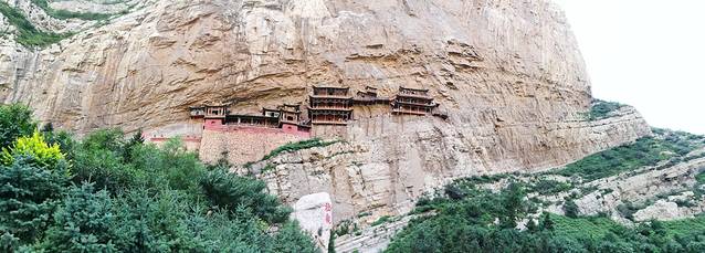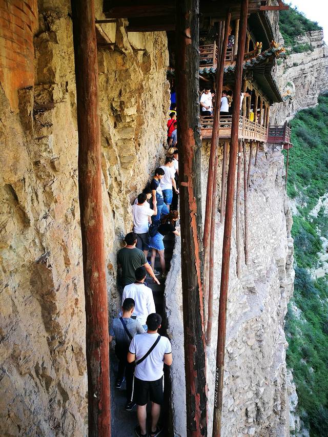 一路行来,中午到达悬空寺,位于大同市的郊县浑源县,与北岳恒山距离很近。悬空寺有两道门票,进门25元,登临寺内100元。老人们不愿爬楼梯,我们既然来了,当然要登临一览。悬空寺有大小四十余间房屋,全都建在悬崖上,以台阶栈道相连,木桩支撑,抗震性能还出奇的好,让人叹为观止。网上下载的解说没什么用,只有一两分钟的介绍。路上碰到一群高大壮实凸肚的老外,担心他们如何爬上栈道,钻进楼梯口。
