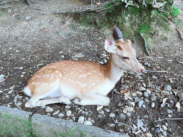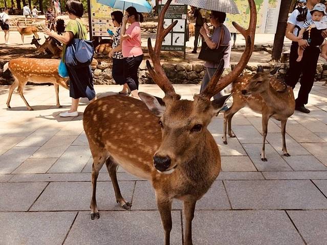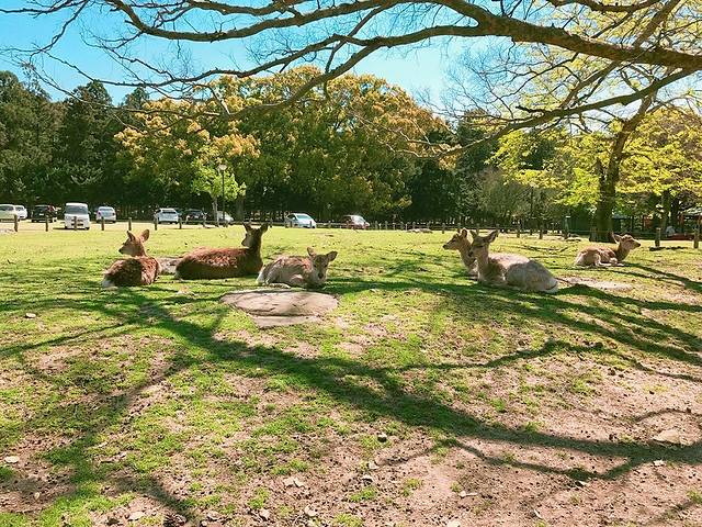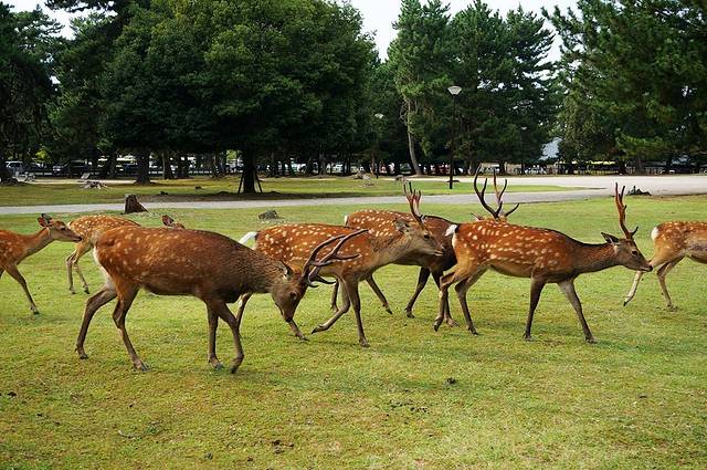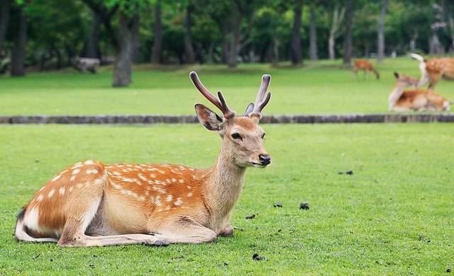 在东西约4公里、南北约2公里的公园里,随处可见成群的梅花鹿,与它们亲密接触是游客到此的一大乐趣。小鹿们或是默默在草地上觅食,或是相互嬉闹玩耍,或是走到你面前来弯下头蹭蹭你,非常讨人喜欢。