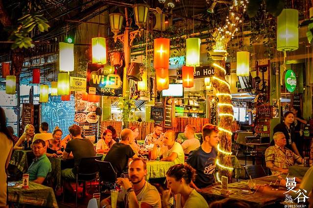 与曼谷其它的景点不同,考山路的中国游客并不多,基本上很多都是欧洲人,这些老外到这里来就是为了呼吸自由的空气和荒废散漫的时光。在这里,外国人会显得更加的轻松惬意,他们穿着人字拖在大街上走来走去,或在咖啡馆里待上一天,晚上去酒吧凑个热闹。而且对于我们来说选个路边的露天座位,欣赏来来往往的各色行人也是一种不错的选择。