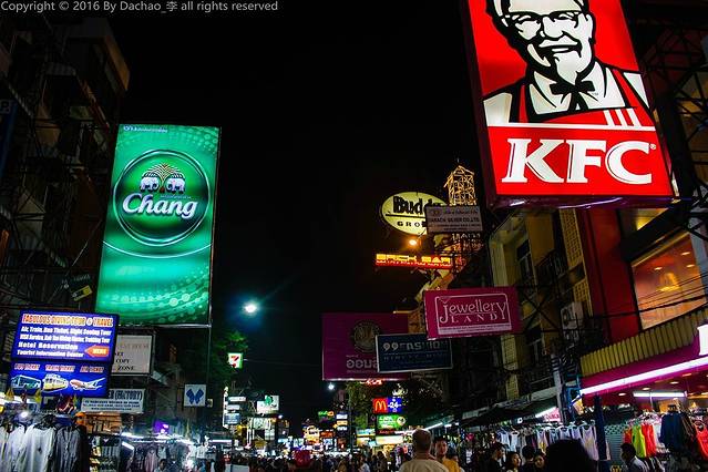 事实上考山路只是一条长300米的小路,走一遍也不过就是15分钟左右,但是其每天夜晚的拥挤程度宛如人肉罐头。林立的广告牌有咖啡厅、酒吧、饭店、住宿的Logo。当然所有广告都与旅行有关,无论是杜蕾斯还是Ipod等,可都是旅行者的最爱。