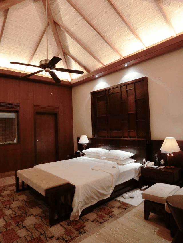 逛完千古情,打车回到婚纱照摄影门店取行李,晚上8:00我们才到达 亚龙湾 维景酒店,从大马路上进入维景酒店,需要穿过一条狭长的小路,因此感觉不是很方便,酒店里有摆渡车,可以接送客人往返酒店大堂-海边-别墅院落。酒店一共108间小别墅,我们定的爱侣别墅,包含一个客厅+餐厅,卫生间,卧室,私人泳池小院和一个SPA池。一晚988元。