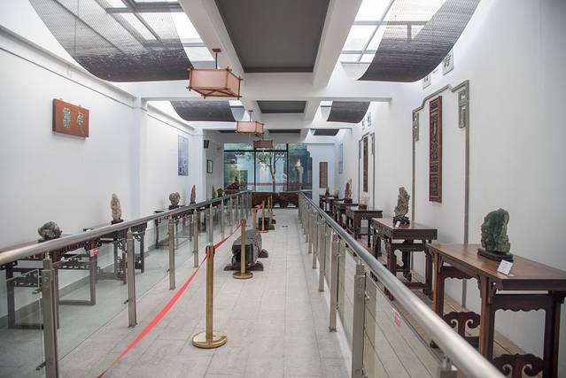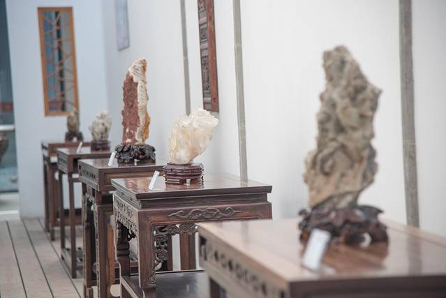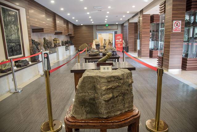 赏石茶艺博物馆,千奇百怪的珍贵原石,让人不禁驻足品味,巨型黄金樟茶槛和红豆杉茶几精致细腻,精雕细琢。
