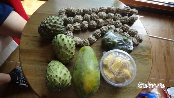 第二天的水果大餐 来自鸿港市场 菠萝蜜10元一碗 木瓜 必吃 10元三斤 释迦果15一斤 槟榔1元一个 哈哈 也算是入乡随俗了 长长圆圆的两条 就是当地的茶 泡完了 王老吉的味道 夏天喝 清肺利咽 5元两条