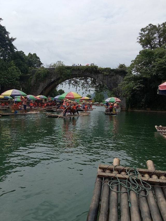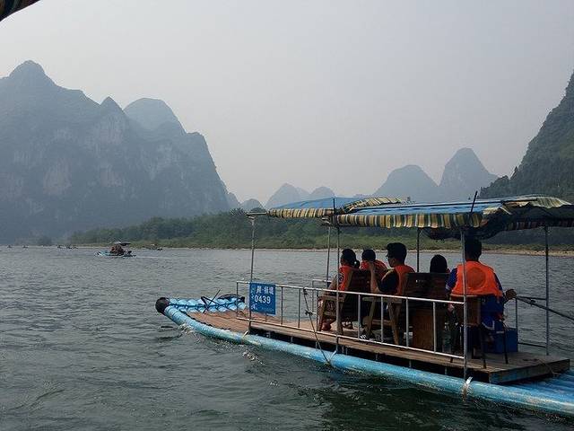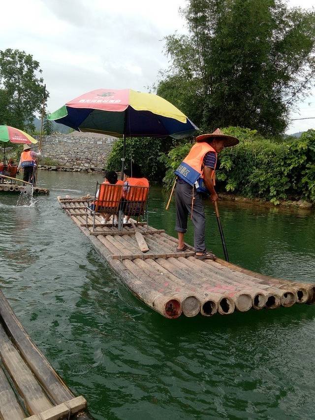 ①竹筏游览的 漓江 ,是杨堤到九马画山段的,4人竹筏,前排2人,后排2人,漂了将近两个小时; 漓江 两岸分光,变化万千,山清、水秀,洞奇、石美,瀑布、流泉,险滩、竹林,也因不同天气而景色各异,晴,青峰倒影;阴,满山云雾;雨,烟雨朦胧;全程无一处不美。